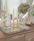 הצגת יצירת האמנות מעור מלאכותי מגש Hadlakos Neiros בצורה מדהימה אור קדוש עיצוב. מגש יוקרתי זה כולל אור קדוש יפהפה הדפס אמנותי על עור ומעליו זכוכית מחוסמת לעמידות בחום. מושלם לנרות שבת, מוסיף נופך של אלגנטיות לכל בית או מתנה מושלמת לאהובים.