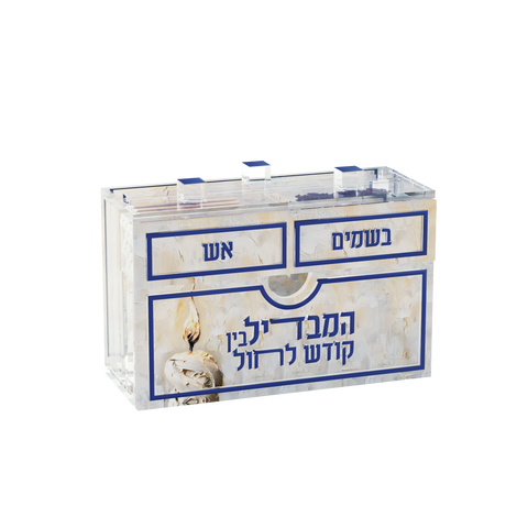 ה סט הבדלה קומפקטי עם להבת זהב מציע פתרון מעודן ומעשי לטקס הבדלה שלכם. סט אלגנטי זה כולל בסמים הולדר , מחזיק המשחק , נר , כרטיס ברכות הבדלה ומגש הבדלה , כולם ארוזים בקופסה ייחודית וקומפקטית עשויה נצנצים לוסיט, מעוטרת במסגרות תלת-ממדיות מתכתיות בולטות וכיתוב. זמין בעיצוב להבה מוזהבת מעודן, ומשלב מסורת עם עיצוב קומפקטי ואלגנטי, מושלם לכל סביבה.