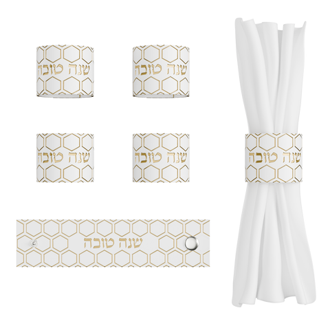 שדרגו את שולחן ראש השנה שלכם עם סט אלגנטי זה של ארבעה טבעות מפיות בצורת חלת דבש . עשויות מעור איכותי ורקומות בעדינות, כל טבעת כוללת טבעת זהב בלעדית חַלַת דְבַשׁ זמין בעיצוב זהב או כסף. מצוידים בסוגר מתכת לסגירה בטוחה, טבעות מפיות אלו משלימות בצורה יפה את עיצוב יום טוב שלכם תוך שמירה על המפיות במקומן בצורה מסודרת. מושלם ליצירת אווירת יום טוב מתוחכמת ומזמינה.